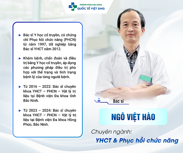 - Chuyên gia Ngô Việt Hào: Hơn 20 năm kinh nghiệm trong lĩnh vực Y học cổ truyền, Vật lý trị liệu và Phục hồi chức năng.