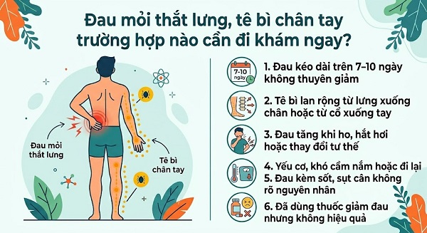 Đặc biệt, nếu đau mỏi thắt lưng và tê bì chân tay xuất hiện đồng thời và ngày càng tăng, bạn nên thăm khám chuyên khoa cơ xương khớp càng sớm càng tốt để được chẩn đoán chính xác.