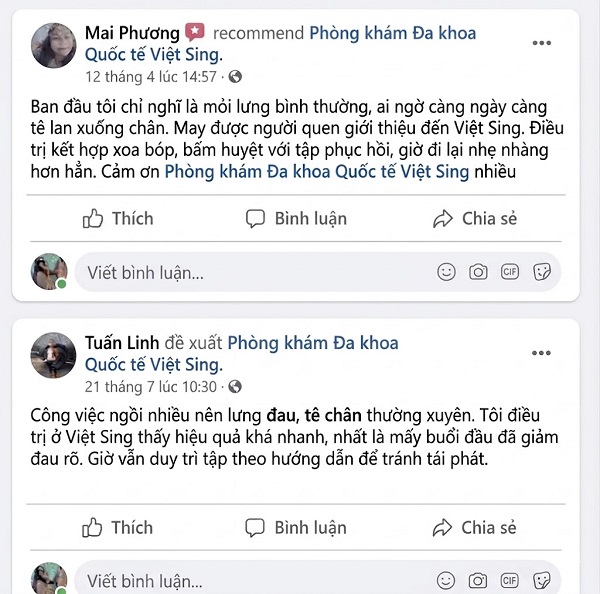 Anh H. (Hà Nội): “Tôi bị đau thắt lưng kèm tê xuống chân gần 1 năm, ngồi làm việc là khó chịu. Sau khi được châm cứu và tập vật lý trị liệu ở Việt Sing khoảng hơn 2 tuần, tình trạng giảm rõ rệt. Giờ ngồi lâu cũng đỡ tê hơn trước nhiều.”