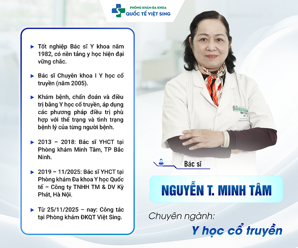 - Bác sĩ CKI Nguyễn Thị Minh Tâm: Hơn 30 năm kinh nghiệm trong lĩnh vực Y học cổ truyền và Phục hồi chức năng.