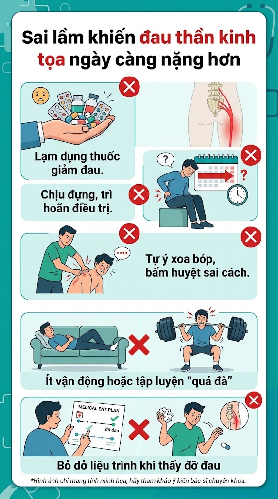 Không ít người “chữa mãi không khỏi” không phải vì bệnh quá khó, mà vì vô tình đi sai hướng ngay từ đầu. Những thói quen tưởng chừng vô hại dưới đây lại chính là lý do khiến cơn đau thần kinh tọa âm ỉ kéo dài, thậm chí ngày càng trầm trọng hơn: