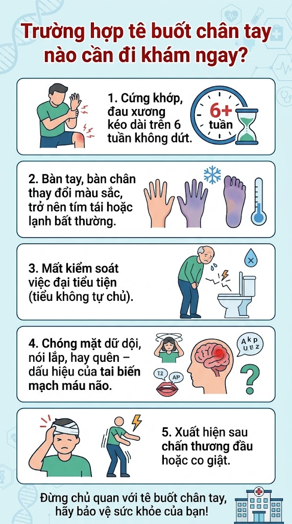 Tê nhẹ thuyên giảm sau khi thay đổi tư thế có thể không đáng lo. NHƯNG hãy đặt lịch hẹn với bác sĩ ngay lập tức nếu tê buốt chân tay kèm theo những dấu hiệu báo động sau: