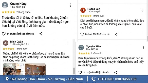 - Chị Phạm Thị H. (TP Bắc Ninh): “Tôi rất hài lòng khi chữa trị tê buốt chân tay tại Việt Sing vì bác sĩ theo sát quá trình điều trị. Tê buốt gần như hết hẳn sau một liệu trình, sinh hoạt thoải mái hơn rất nhiều.”